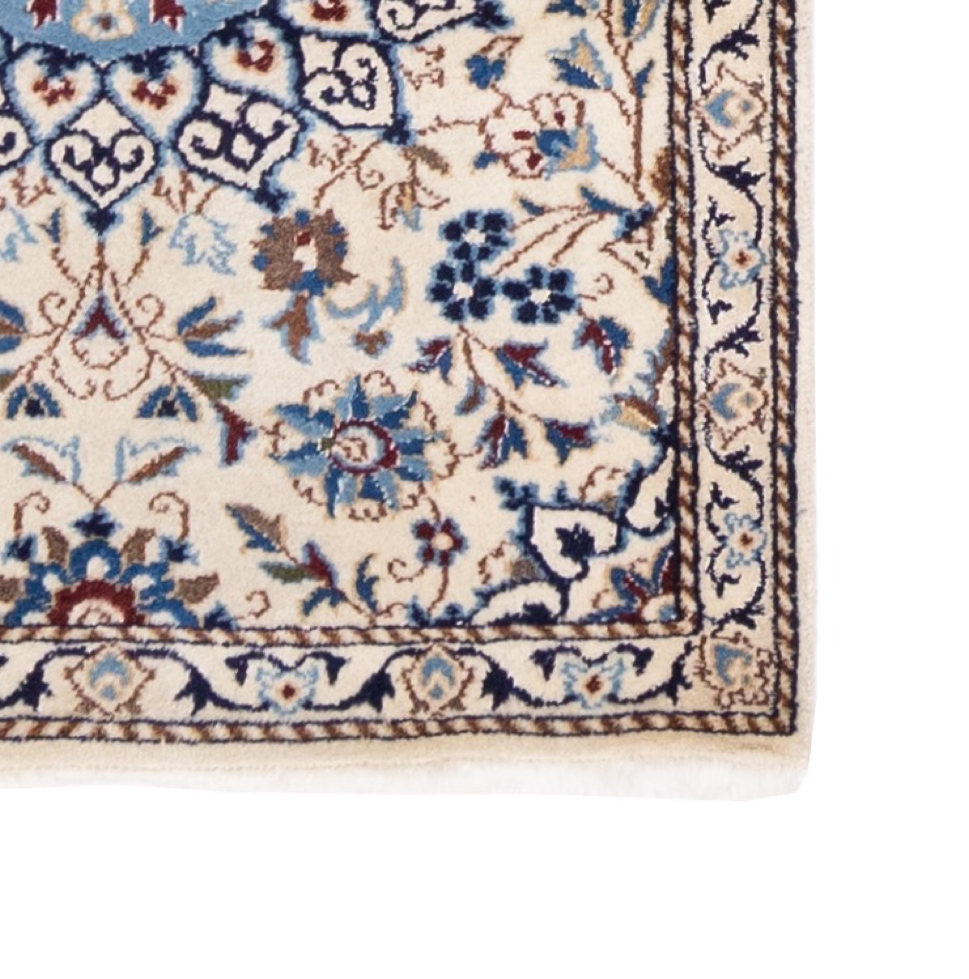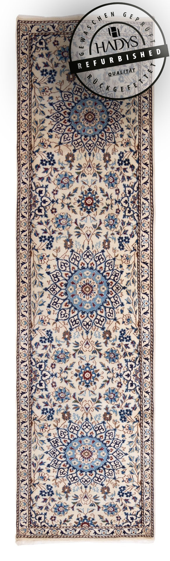 Refurbished & Hochwertig: Entdecken Sie die Schönheit traditioneller Handwerkskunst neu! Unsere handgeknüpften Teppiche vereinen zeitlose Eleganz und hochwertige Verarbeitung. Jedes Stück wird sorgfältig restauriert und neu aufbereitet – gewaschen, geprüft und in bestem Zustand, um Ihr Zuhause mit einzigartigem Stil zu bereichern. Was bedeutet „refurbished“? Diese Teppiche haben vielleicht kleine Schönheitsfehler – leichte Abnutzung an den Kanten oder Fransen, minimale UV-Licht-Veränderungen – aber lassen Sie sich davon nicht täuschen! Sie sind von der Beschaffenheit und Qualität einem neuen Teppich nahezu ebenbürtig. Jedes Detail wird mit Liebe zum Handwerk gepflegt, sodass Sie einen Teppich erhalten, der nicht nur robust und langlebig ist, sondern auch den Charme und die Geschichte des Originals bewahrt. Ihre Vorteile: Hochwertige Handwerkskunst: Jeder Teppich wurde in traditioneller Handarbeit gefertigt und bietet langlebige Qualität. Refurbished wie neu: Sorgfältige Aufbereitung bringt diese Teppiche auf ein Niveau, das einem neuen Teppich sehr nahekommt – und das zu einem unschlagbaren Preis. Einzelstücke mit Charakter: Jedes Exemplar erzählt seine eigene Geschichte und bringt eine einzigartige Atmosphäre in Ihr Zuhause. Greifen Sie jetzt zu und verleihen Sie Ihren Räumen das gewisse Extra! Diese handgeknüpften Schmuckstücke sind nicht nur Dekoration, sondern ein Statement für Stil, Qualität und Nachhaltigkeit. Jetzt zugreifen und handgeknüpfte Exzellenz zum besten Preis erleben! Dieser Teppich gehört zur Gruppe der Nain-Teppiche, die weltweit als die besten und feinsten Orientteppich betrachtet werden. Grund hierfür ist die besonders hohe Knotendichte und die ausgesprochen feine Korkwolle, die aus dem weichen Nackenbereich bei der ersten Schur der Schafe genommen wird. Dadurch ist die Wolle sehr fetthaltig und entsprechend schmutzabweisend. Die dünnen Fäden werden typischerweise zu floralen Mustern verknüpft mit ausgeprägtem Mittelmedaillon, wie hier gut zu sehen. Hinweis: Die Bezeichnung steht für den Designstil bzw. die Mustertradition und ist kein Hinweis auf das Herstellungsland.